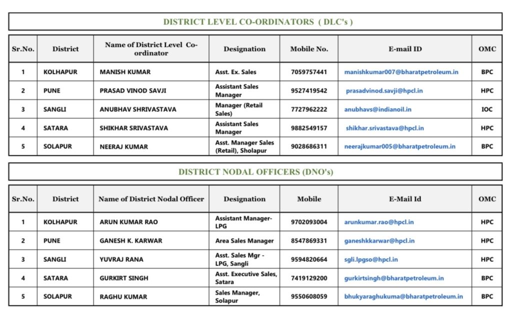 पुणे विभागातील गॅस कंपन्यांच्या प्रतिनिधींचे संपर्क क्रमांक